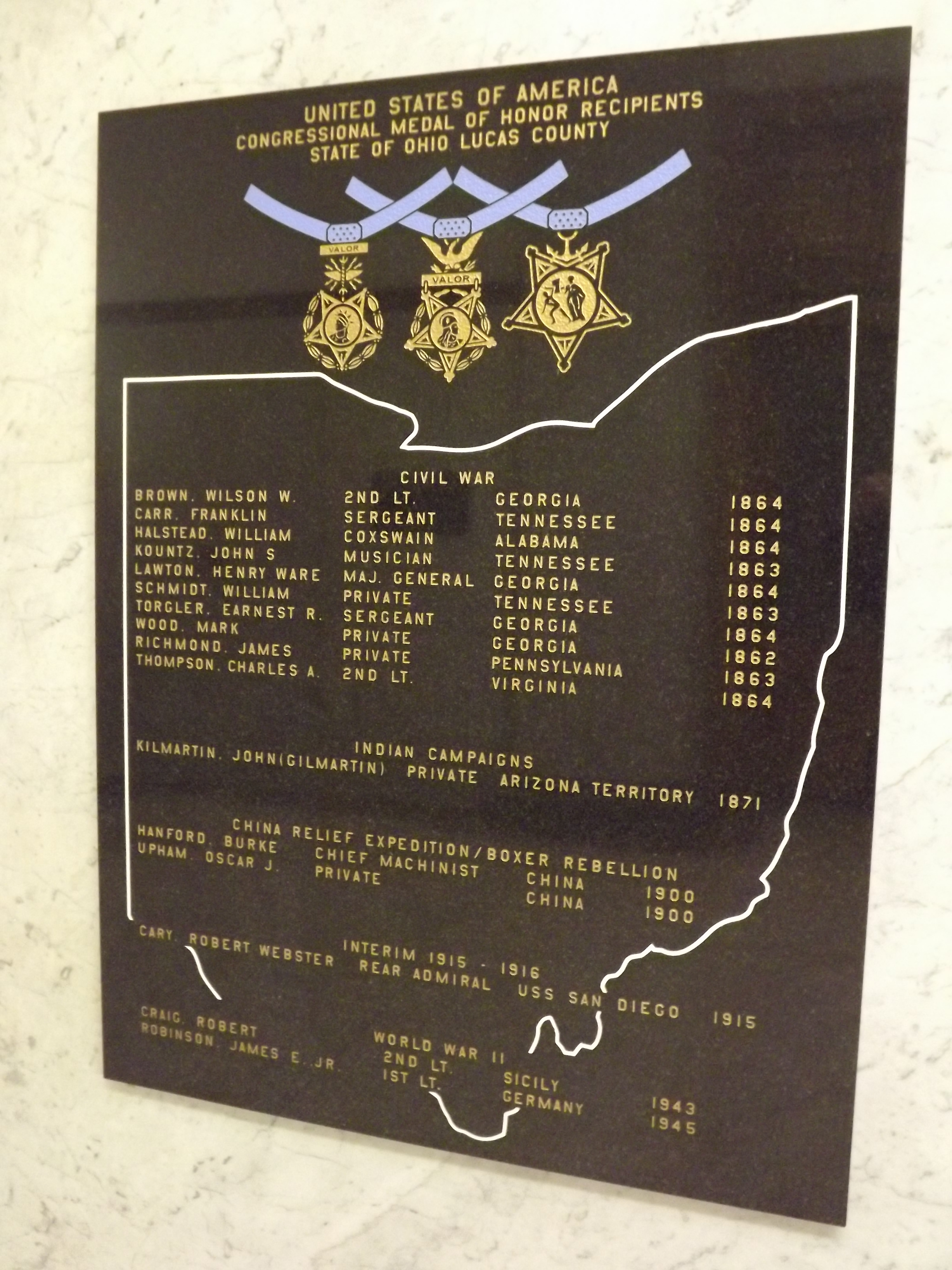 The new plaque will list 17 Medal of Honor recipients who served from the Civil War to World War II who were born in, livedin , entered service in, died in or were buried in Lucas County.