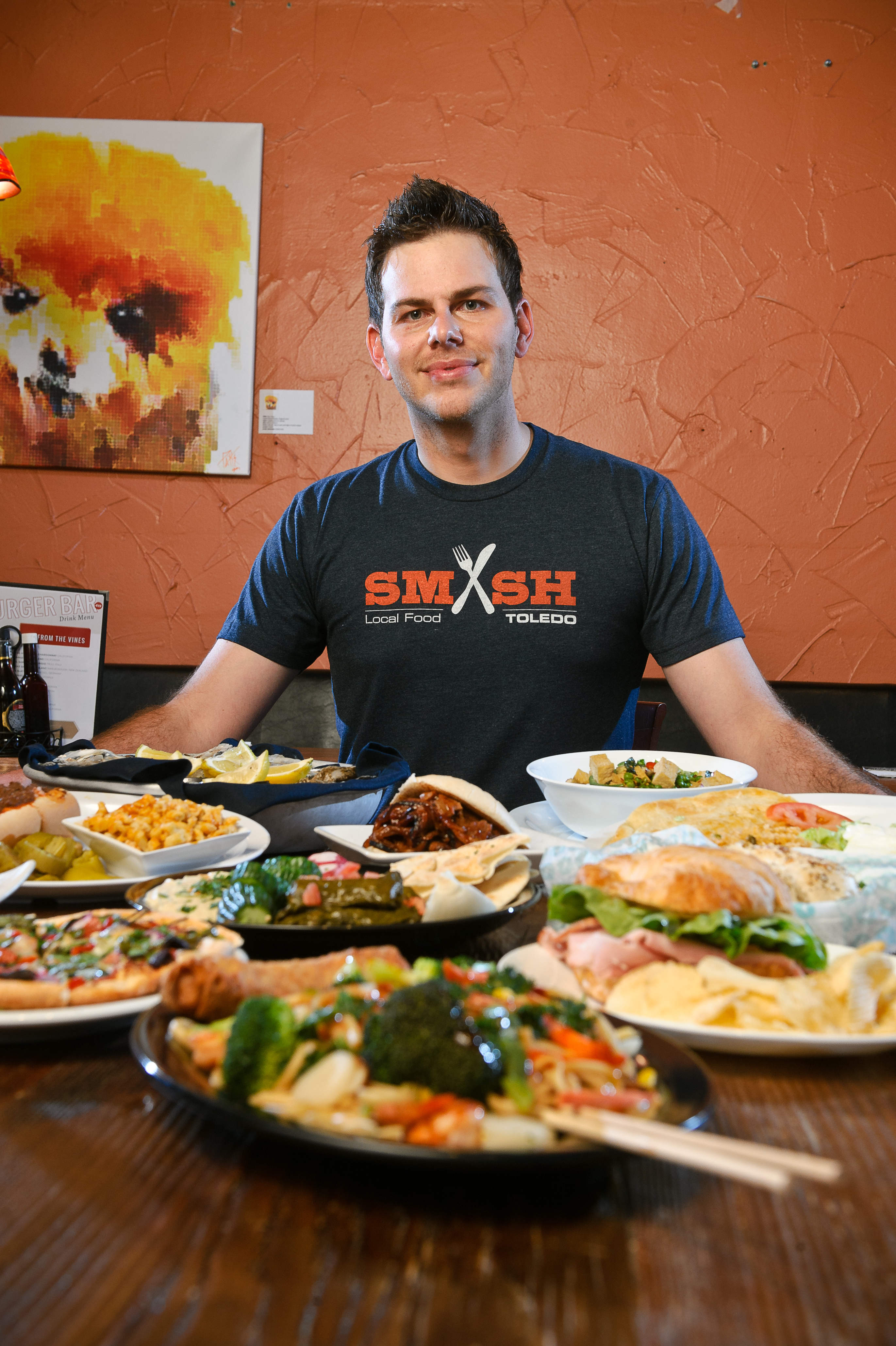 Smash Toledo founder Josh Wagy with dishes from Mancy’s Bluewater Grille, Bangkok Kitchen, Tony Packo’s, Deet’s BBQ, Mi Hacienda, Burger Bar 419,